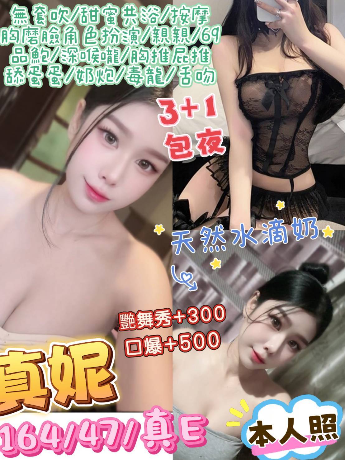 👍項目:無套吹/甜蜜共浴/按摩/胸膜臉/角色扮演/親親/69/品鮑/冰火/胸推/屁推/舔蛋蛋/奶炮/舌吻/角色扮演